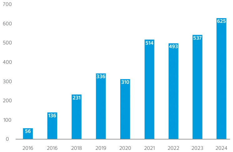 また、下記(図表2)は国内におけるサステナブル投資残高の推移です。こちらも右肩上がりに推移しており、2024年には投資合計額は625兆6,096億1,100万円(前年比+16.6%)で、総運用資産残高に占める割合も63.5%におよんでいます。