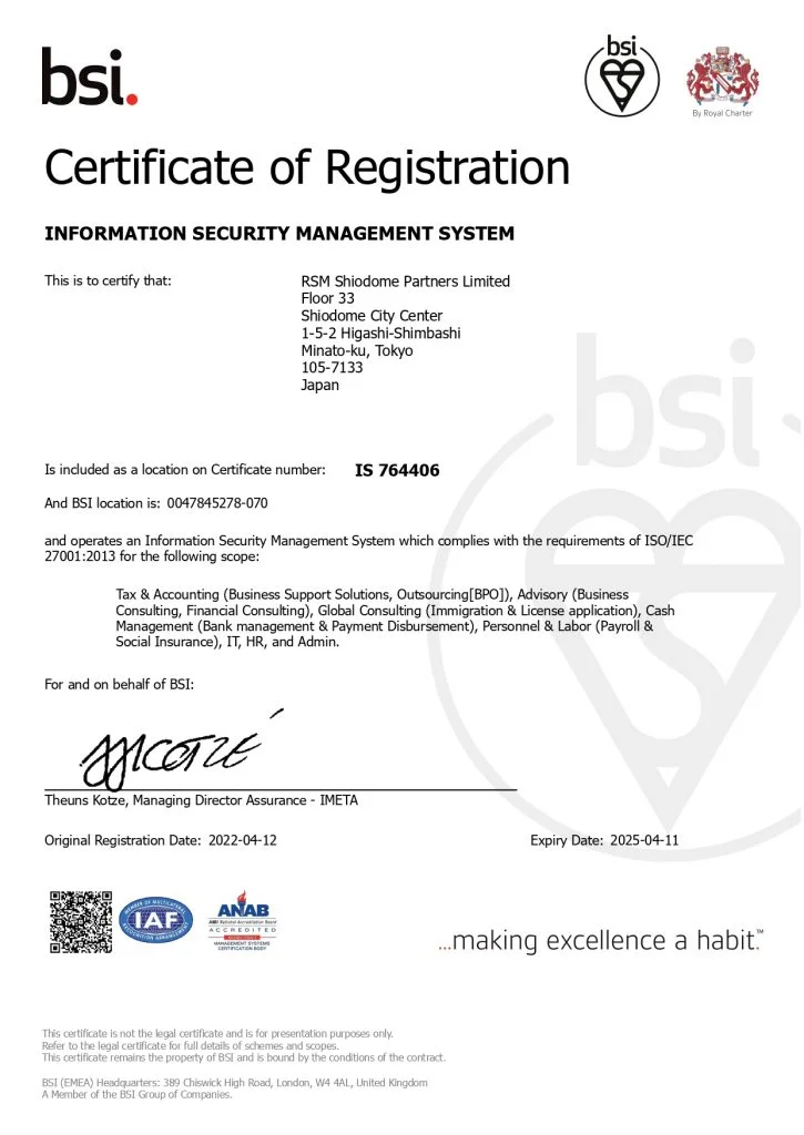 この度、RSM汐留パートナーズ株式会社は、情報セキュリティマネジメントシステム(ISMS)の国際規格であるISO27001の認証を取得いたしました。