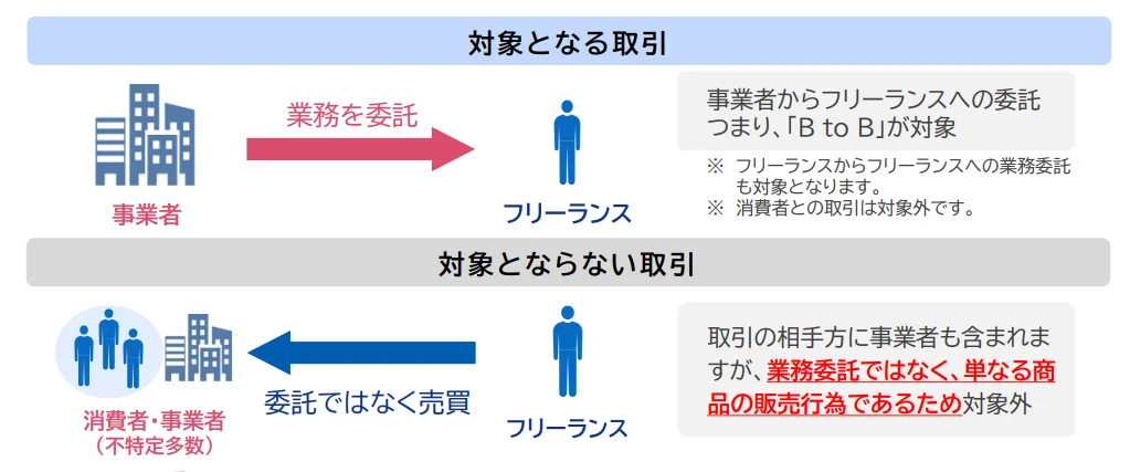 よって、フリーランスが消費者のみから委託を受ける場合や、企業等からの業務委託を受けているが、当該業務とは異なる事業について、消費者から委託を受ける場合は対象とはなりません。