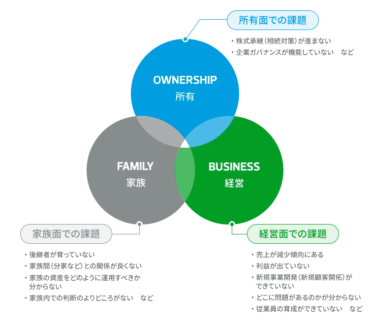 ファミリービジネスには強みがある一方、課題も存在します。課題は大きく分けると、「オーナーシップ」、「ファミリー」、「経営」の3点に分類されます。