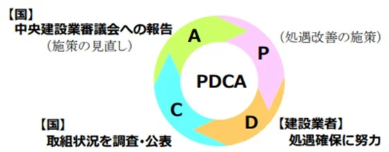 改正法では、「建設業者は、その労働者が有する知識、技能その他の能力についての公正な評価に基づく適正な賃金の支払その他の労働者の適切な処遇を確保するための措置を効果的に実施するよう努めなければならない。」と規定しました。改正法は建設業者に対して労働者の処遇確保を努力義務化するとともに、国は当該処遇確保に係る取り組み状況を調査し、公表するよう求めています。